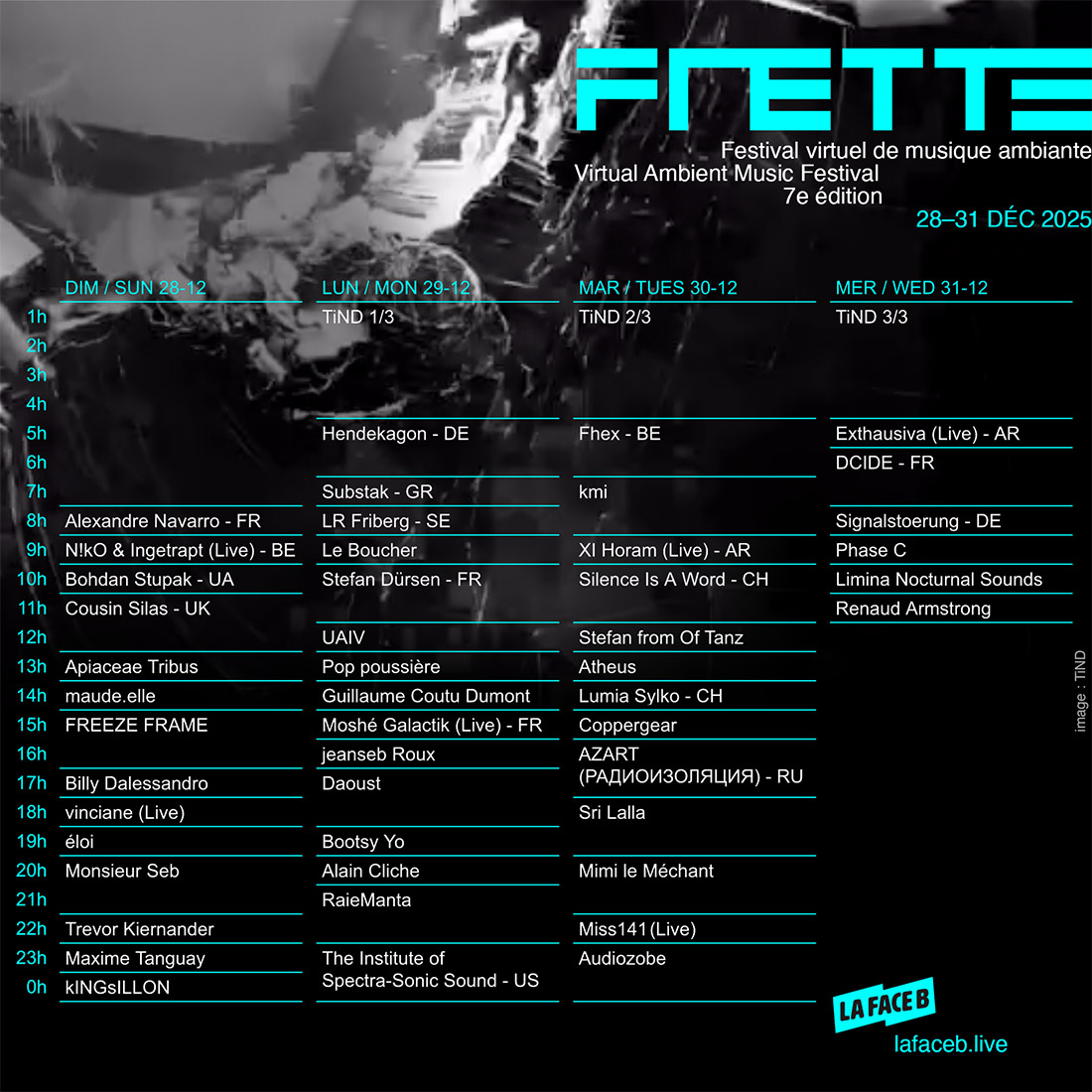 Pour sa 7e édition, FRETTE est présenté par La Face B et diffusé exclusivement sur lafaceb.live, réunissant des artistes basés au Québec ainsi que des artistes provenant du monde entier.